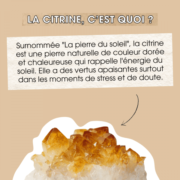 Surnommée « La pierre du soleil », la citrine est une pierre naturelle de couleur dorée et chaleureuse qui rappelle l’énergie du soleil. Elle a des vertus apaisantes surtout dans les moments de stress et de doute.