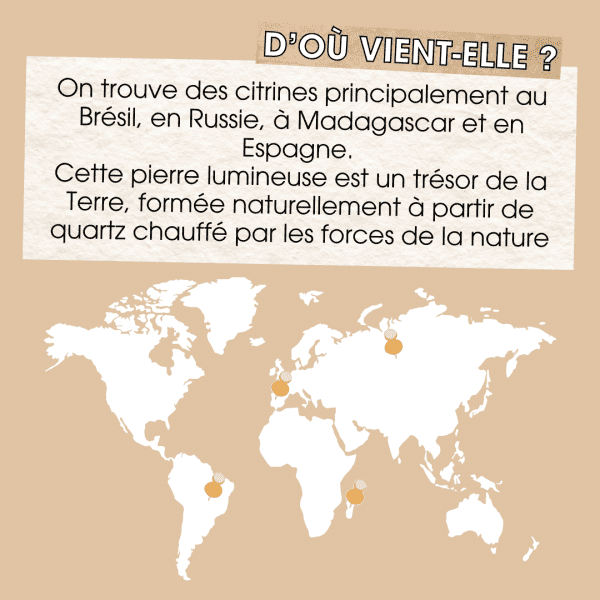 On trouve des citrines principalement au Brésil, en Russie, à Madagascar et en Espagne.