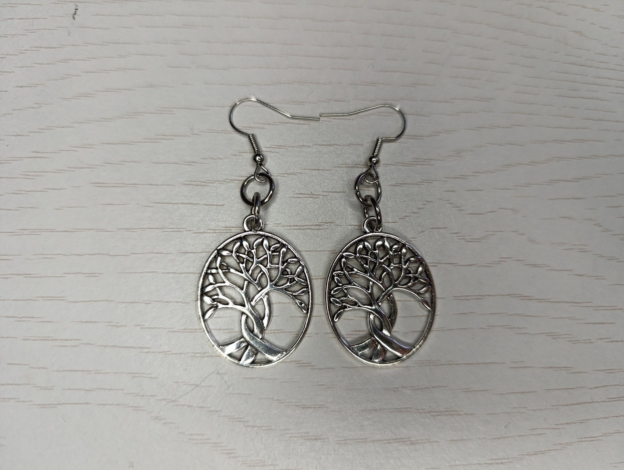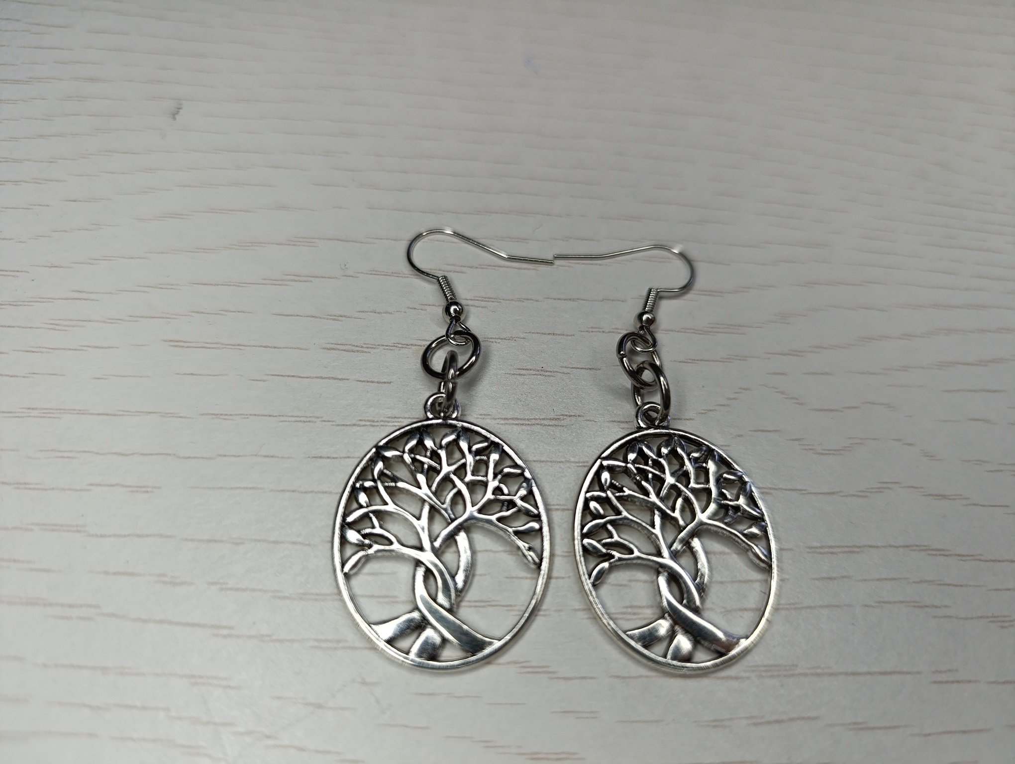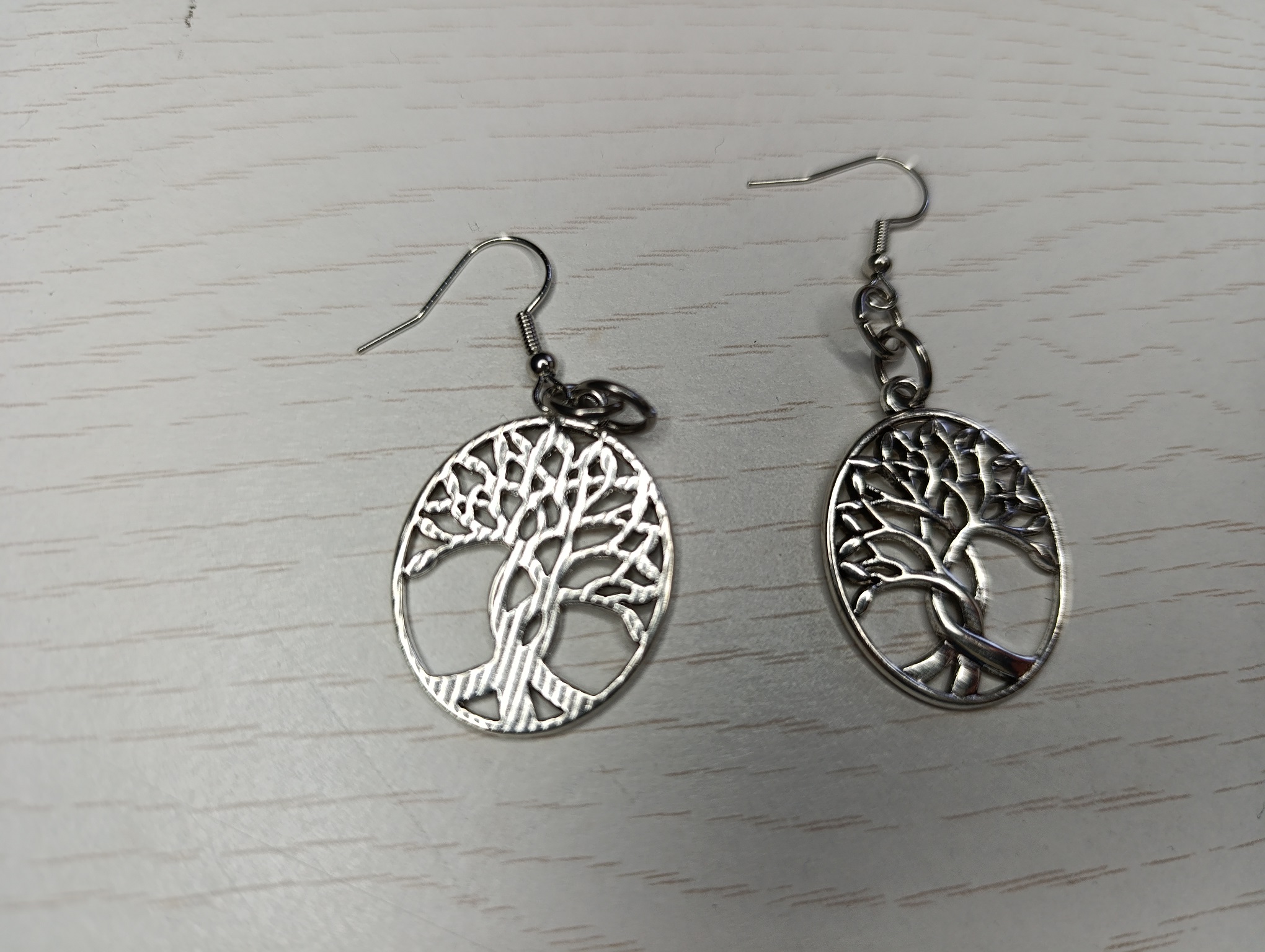 Le produit est une paire de boucles d’oreilles en métal argenté, plein et de forme ovale. L’ellipse représentant l’arbre de vie fait environ 2.2cm de large par 3cm de haut. La hauteur total avec la boucle pendante fait environ 6cm. Chaque boucle fait environ 3.5gr