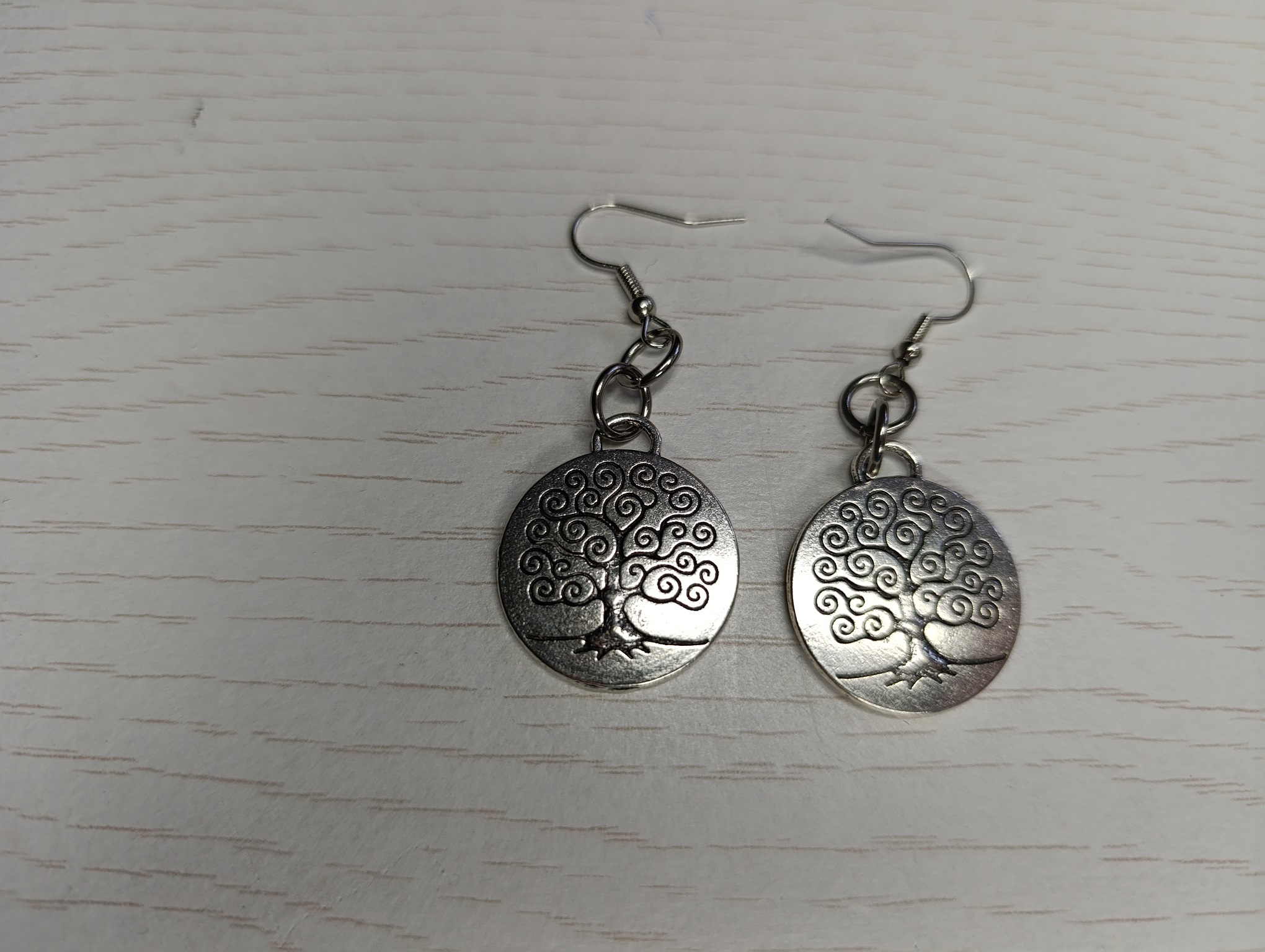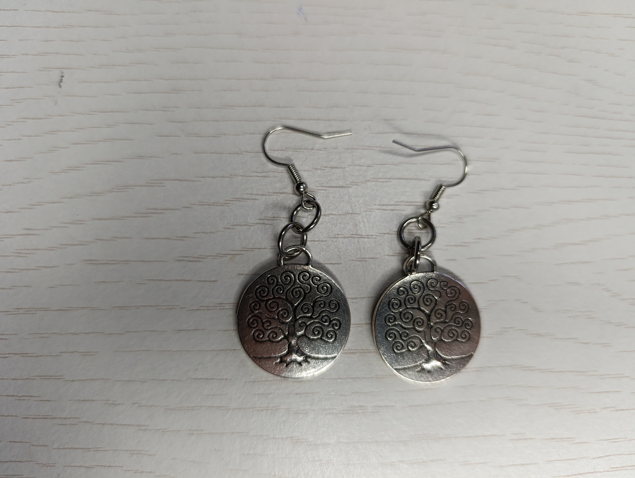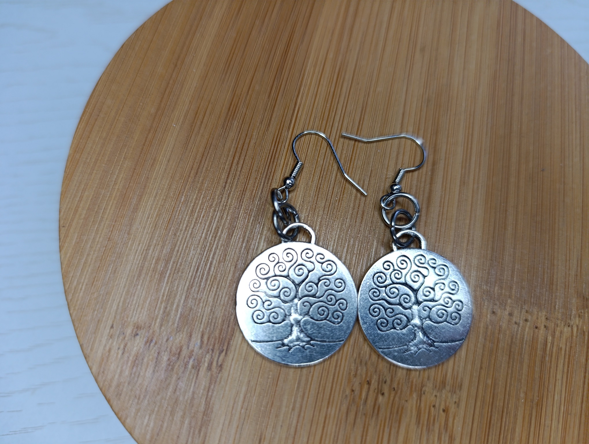Le produit est une paire de boucles d’oreilles en métal argenté, plein et de forme ronde. Le cercle représentant l’arbre de vie fait environ 2.2cm de diamètre. La hauteur total avec la boucle pendante fait environ 5cm. Chaque boucle fait environ 5.6gr