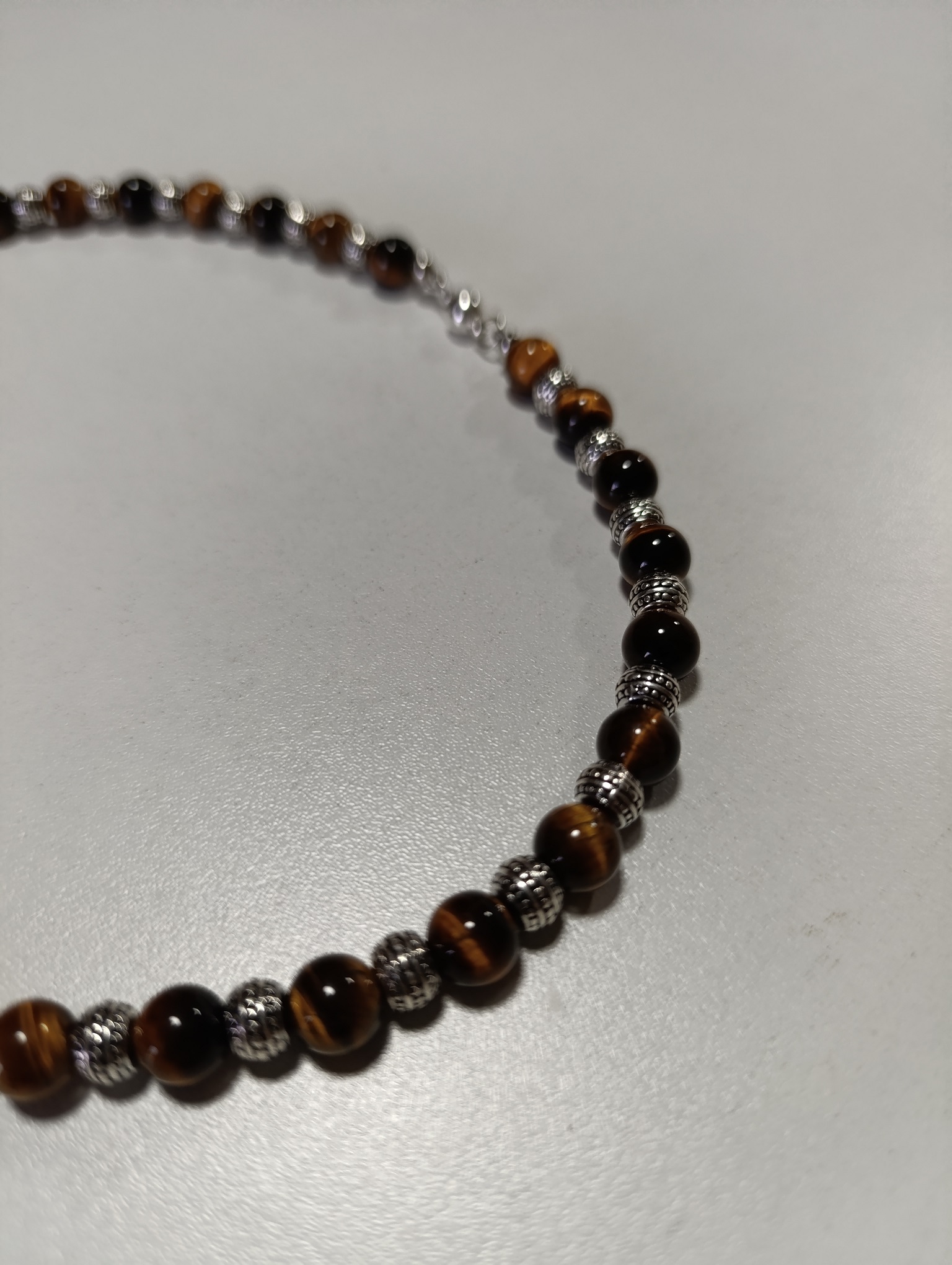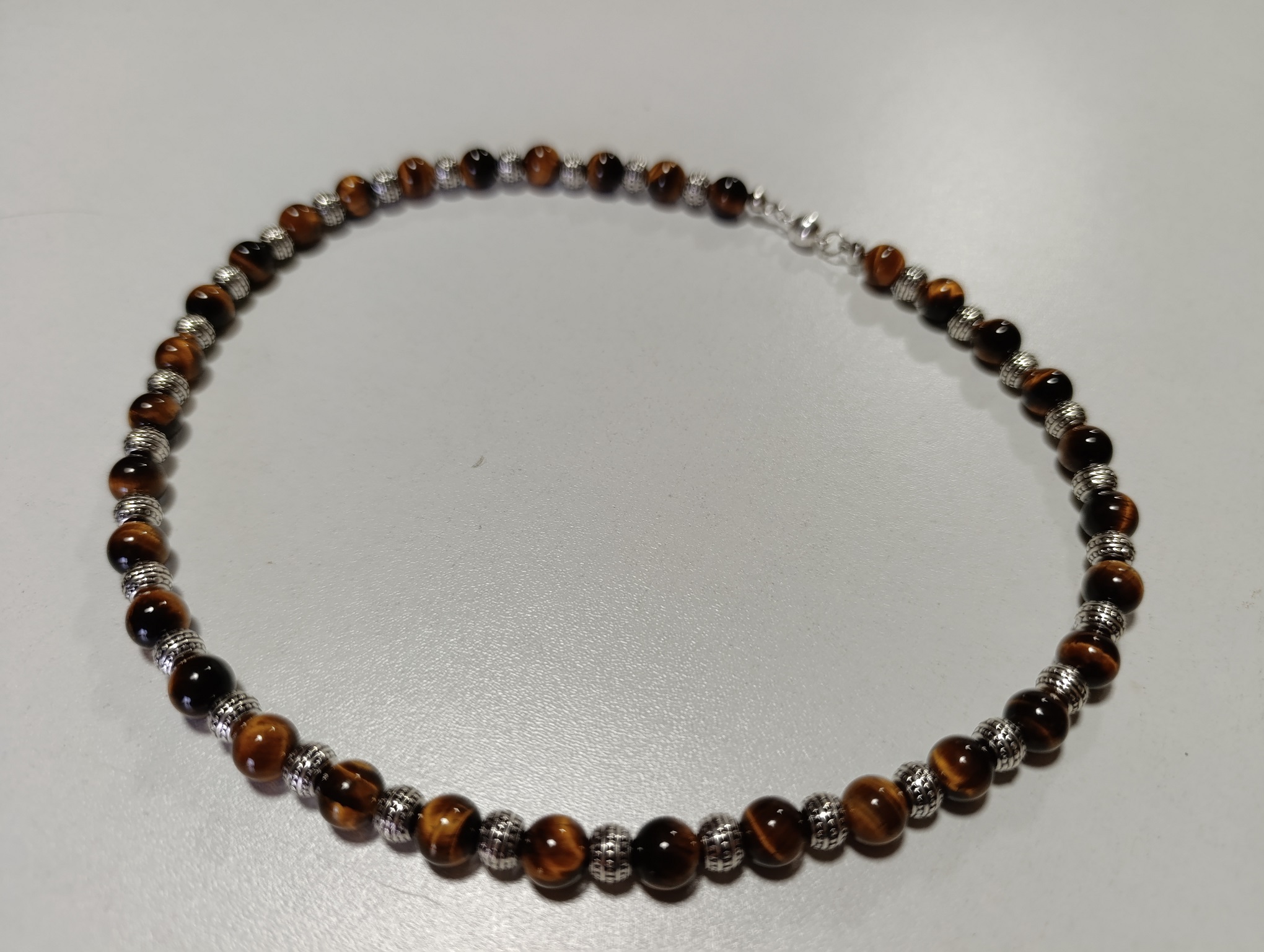Collier en Oeil de tigre boule 8mm et alliage argenté