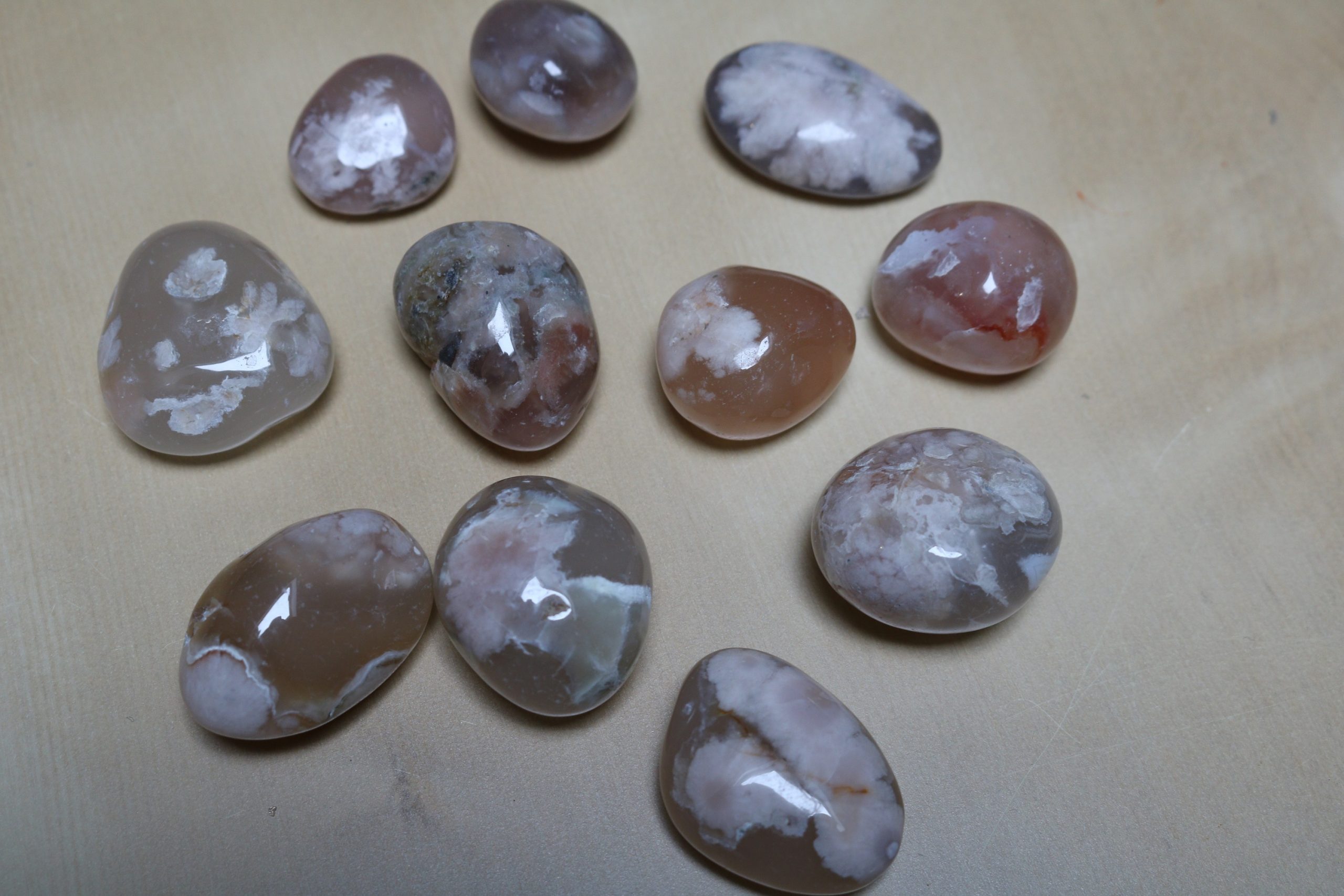 Le produit est une pierre roulée en Agate Fleur Cerisier originaire de Madagascar, Qualité AA. Les dimensions sont d’environ 20 à 30mm.