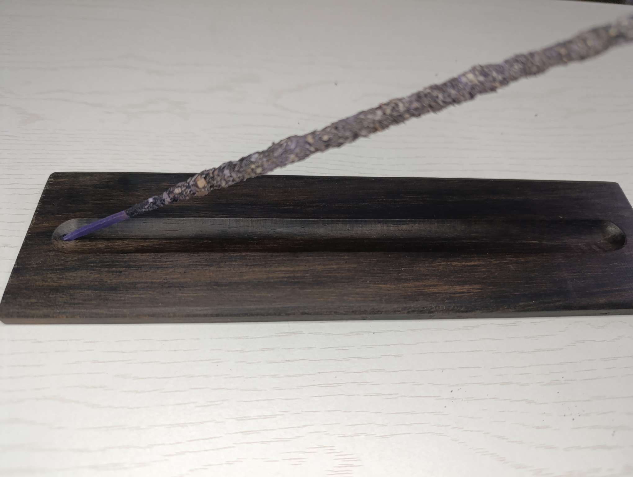 Il s’agit d’un support pour les bâtons d’encens fait artisanalement par nous même. Le support fait 6.5cm par 25cm par 0.7cm.